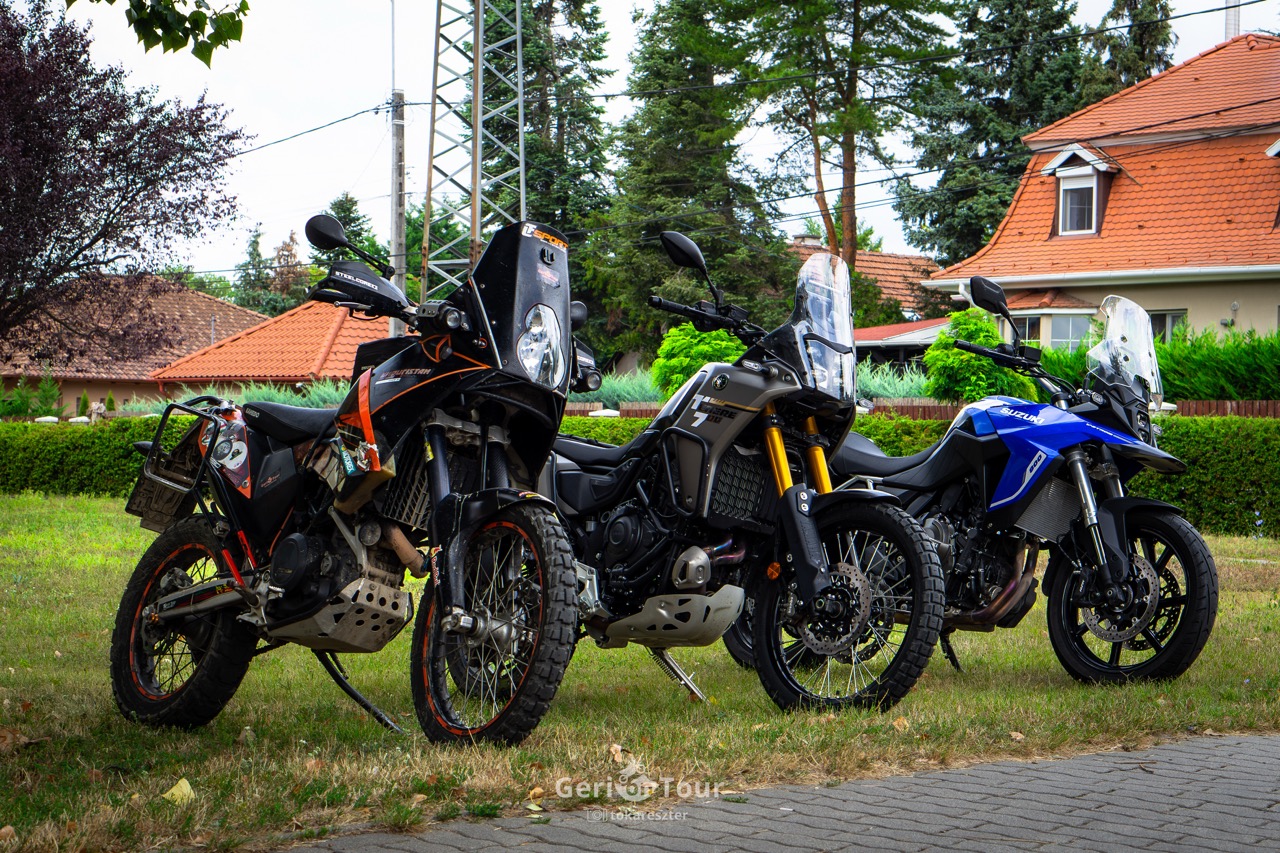 Na szóval átveszem a motort, és csak nézem. Fejemben a gondolat, hogy most akkor mi ez. 150 mm rugóút a DE verzió 220 milliméteréhez képest. Még épp nálam volt a Yamaha Tenere 700 is, így az én motorommal egybevonva tudtunk készíteni gyorsan egy 3 motoros összehasonlítást.